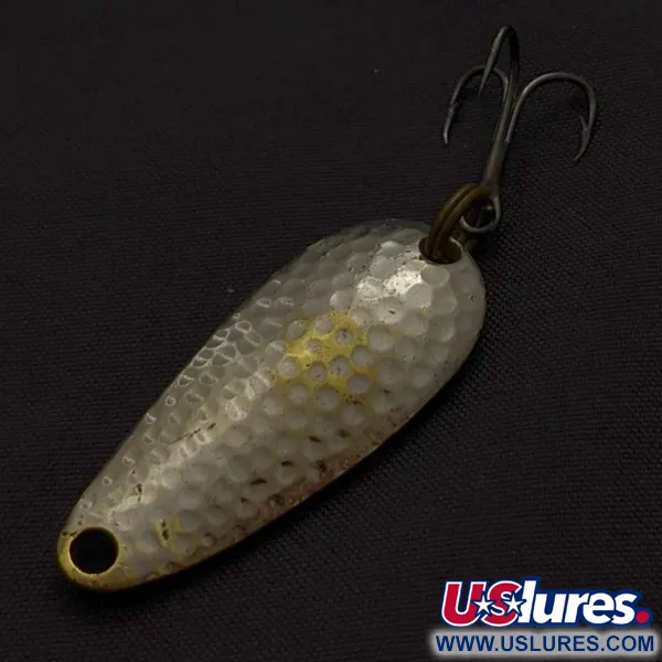 Con una longitud exacta de 4 cm (1 1/2"), su perfil en forma de lágrima resalta la fabricación clásica estadounidense de la Nebco Tor-P-Do 1. Con un peso de 9 g (1/3 oz), este señuelo (código: 24173) presenta un acabado en níquel martillado sobre un cuerpo de latón, con el metal base asomando en pequeñas zonas auténticas. Esta pieza de colección se encuentra en un estado 4/5, con una apariencia limpia y bien conservada. La superficie con hoyuelos profundos está diseñada para emitir destellos de luz en varios ángulos durante la recogida, e incorpora un robusto anzuelo triple sujeto mediante una anilla abierta. Diseñada para lances en agua dulce, la parte frontal cuenta con un sencillo orificio para asegurar la línea.