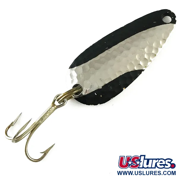 Texturas de níquel martillado combinadas con llamativos acentos negros definen el perfil visual impactante de esta cucharilla vintage. Con un tamaño de 1 1/2" (4 cm) y un peso de 1/4 oz (7 g), el ejemplar lleva el sello distintivo "NEBCO" TOR-P-DO-1 junto con sus orígenes en Ripley, Miss. en el reverso pulido. La cara frontal presenta un acabado martillado diseñado para captar y proyectar la luz, enmarcado por pintura negra profunda en las puntas. Identificada con el código de producto 6235, la cucharilla está equipada con un anzuelo triple clásico asegurado por una anilla abierta resistente. Su fabricación en metal sólido es típica de la manufactura estadounidense de mediados de siglo de los EE. UU. El estado es excelente, mostrando un acabado bien conservado y un sellado nítido en todo el cuerpo, obteniendo una calificación de 5/5. El orificio para la línea está limpio y perforado con precisión en el extremo estrecho de la forma de lágrima.