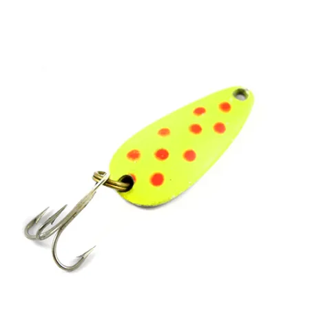 Con un peso de 9 g (1/3 oz), esta cucharilla compacta presenta una cara frontal de color amarillo vibrante acentuada por distintas manchas de color rojo anaranjado. El reverso revela un acabado de níquel pulido profundamente estampado con "NEBCO" y "TOR-P-DO", mostrando su herencia de fabricación estadounidense. Con una longitud de 4 cm (1 1/2"), el cuerpo metálico está equipado con una robusta anilla de latón y un anzuelo triple plateado. La aplicación de pintura en la parte delantera es notablemente nítida, mientras que la parte trasera de níquel conserva un brillo intenso, lo que respalda una calificación de estado de 4/5 para este modelo 2751. Los pescadores suelen utilizar este perfil de lágrima para diversas aplicaciones de lanzado o curricán. Las letras estampadas en el lado cóncavo permanecen nítidas y legibles, un detalle clave para los coleccionistas de aparejos Nebco antiguos.