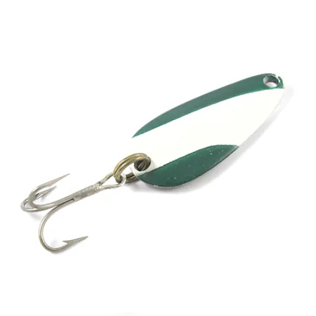 Llamativas bandas diagonales verdes y blancas caracterizan el acabado de esta clásica cucharilla de lanzado de fabricación estadounidense. Con una longitud de 1 1/2" (4 cm), la Nebco Tor-P-Do presenta un perfil compacto que combina perfectamente con su peso de 1/3 oz (9 g) para lances de larga distancia efectivos. La parte posterior del señuelo presenta un acabado de níquel brillante, donde la marca del fabricante "NEBCO TOR-P-DO PEQUOT, MINN." está cuidadosamente estampada, vinculando este espécimen a su herencia de Minnesota. Este artículo específico, identificado por el código de producto 2773, conserva sus herrajes originales, incluyendo una robusta anilla abierta de tono latón y un anzuelo triple de puntas afiladas. Su estado está calificado con un alto 4/5, mostrando una superficie limpia y un esmalte vibrante en las secciones pintadas. Su cuerpo en forma de lágrima está diseñado para ofrecer versatilidad en diversas capas de agua según la velocidad de recogida favorecida por el pescador.