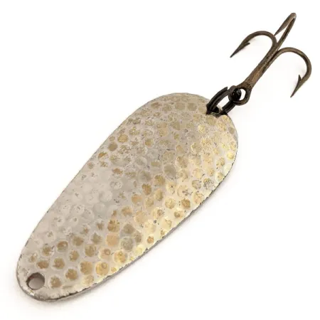 Las texturas de latón martillado crean una superficie reflectante distintiva en esta cucharilla ondulante de 25g (1oz). En el reverso está grabada claramente la marca Tor-P-Do 3, identificando su origen en Minneapolis, Minnesota, bajo la marca Nebco. Con una longitud de 6,5 cm (2 1/2"), el cuerpo metálico mantiene un acabado limpio, con una calificación de estado de 5/5. Este ejemplar, identificado por el código 12762, presenta un perfil de gota de agua diseñado para la estabilidad durante el curricán de profundidad o los lances de larga distancia. El hardware es robusto, compuesto por un anzuelo triple de gran calibre fijado mediante una anilla abierta de alta resistencia. Un ojal perforado en el extremo estrecho proporciona un punto de fijación seguro para un bajo de línea o un esmerillón.