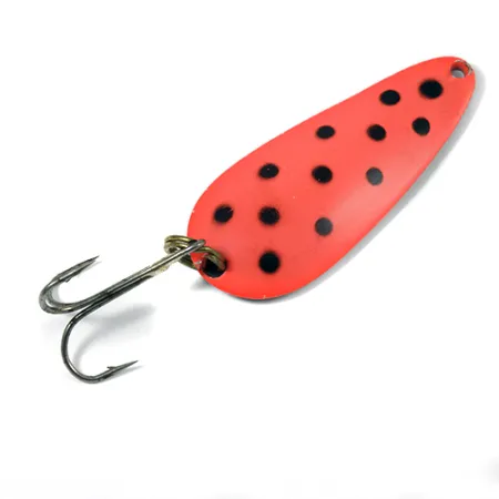 En el reverso niquelado aparece grabado claramente "NEBCO TOR-P-DO 4", lo que identifica a esta clásica cucharilla ondulante fabricada en Holdingford, Minnesota (EE. UU.). Con un peso de 45 g (1 2/3 oz), el señuelo está diseñado para alcanzar grandes profundidades o cortar el viento en lances largos. La cara frontal presenta un acabado rojo vibrante con puntos negros, una opción de alta visibilidad para aguas tomadas. Con 7,5 cm de longitud, su estructura robusta refleja el diseño utilitario típico de los equipos vintage de Nebco. Este ejemplar, catalogado bajo el código 2083, mantiene su atractivo visual con una calificación de estado de 4/5. Los herrajes son funcionales, con un anzuelo triple reforzado unido por una anilla abierta sólida en la base del cuerpo en forma de lágrima.