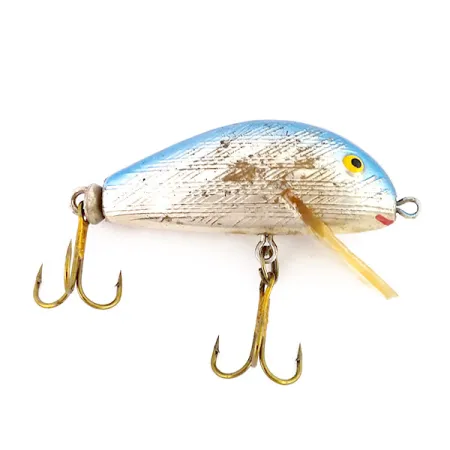 Un acabado plateado con textura de trama cruzada y lomo azul define este señuelo temprano de Bill Norman, mostrando el desgaste honesto de una muestra que ha visto mucha agua. Con un peso de 3/16 oz (5,5 g), este modelo flotante de 1 3/4" (4,5 cm) representa la era fundacional de la marca Norman en los EE. UU. El perfil redondeado se acentúa con un ojo amarillo brillante con pupila negra y una marca roja distintiva en el morro. Equipado con un babero angular para alcanzar profundidades de hasta 4 pies (1,2 m), está diseñado tanto para el lanzado como para el curricán. Este espécimen, con código de producto 9595, conserva sus dos anzuelos triples montados en el vientre con un acabado en tono dorado. El estado es un respetable 4/5, ya que los laterales plateados muestran algunos rasguños superficiales auténticos manteniendo la integridad de la pintura original.