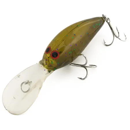 Este crankbait de gran profundidad Norman DD 14 destaca por su cuerpo translúcido en color oliva, que alberga destellos vibrantes de purpurina púrpura y verde. Identificado con el código de producto 7478, este señuelo mide 7 cm (2 3/4") y pesa 16 g (3/5 oz). Su construcción integra un sonajero interno para una mayor presencia acústica bajo el agua y presenta una flotabilidad suspendida (suspending) que permite aplicar diversas técnicas de recogida. El generoso babero transparente está diseñado para alcanzar profundidades de entre 3,6 m y 4,2 m (12-14 pies), lo que lo hace sumamente eficaz tanto para lanzado como para curricán. En la zona de la cabeza, los llamativos ojos rojos ofrecen un punto de contraste nítido sobre el acabado oliva. Los componentes se encuentran en excelente estado, con una valoración de 5/5, manteniendo sus anillas abiertas y anzuelos triples originales. Este ejemplar de fabricación estadounidense muestra el perfil clásico de Norman con su distintivo plástico inyectado con purpurina.