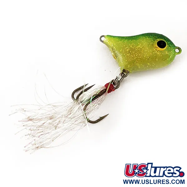 Adornado con destellos plateados y un hilo rojo en el anzuelo triple, este modelo muestra la utilidad clásica del diseño Norman "Front Runner". El cuerpo de 2,2g (1/16oz) presenta un vibrante degradado amarillo y verde, muy acentuado con finas purpurinas doradas que captan la luz con eficacia. Con una longitud de sólo 3cm (1 1/4"), fue diseñado como un teaser de superficie para ser montado en línea por delante de un walking bait o popper de mayor tamaño. Los ojos negros sobredimensionados con perímetros amarillos permanecen claros y centrados, proporcionando un blanco de ataque prominente. Con el código de producto 11599, este señuelo fabricado en EE.UU. se encuentra en un excelente estado 5/5. Los herrajes están brillantes y la pintura mantiene el lustre original del vientre chartreuse y el lomo verde oscuro.