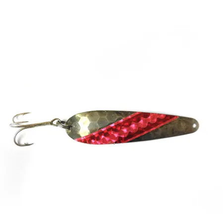 14 g (1/2 oz) de latón macizo forman el cuerpo de esta Northern King 28, una cucharilla de curricán nacida de la herencia canadiense de Len Thompson en 1984. Una llamativa franja diagonal holográfica roja atraviesa el acabado color acero, complementando la mitad superior plateada y martillada que captura la luz incluso en condiciones de poca visibilidad. Con una longitud de 9,5 cm (3 3/4"), este ejemplar (código de producto 0113) mantiene un aspecto limpio y brillante, con un estado de conservación de 4/5. El uso de un auténtico baño de plata fue una elección técnica del fabricante para asegurar que la cucharilla fuera visible a las grandes profundidades por donde suelen moverse las truchas de lago y los salmones. Está equipada con un anzuelo triple estándar y una robusta anilla abierta.