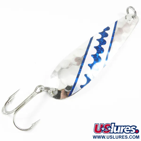 Con un peso de 1/2oz (14g), esta cucharilla de fabricación canadiense cuenta con un chapado en plata auténtica diseñado específicamente para la reflexión de la luz a grandes profundidades. La Len Thompson Northern King 28 UV, catalogada con el código de producto 3530, es un señuelo de curricán fabricado en latón que mide 3 3/4" (9,5 cm). Introducida originalmente en 1984, la línea Northern King utiliza el chapado en plata para garantizar que el metal permanezca visible mientras desciende. Este ejemplar específico muestra una textura martillada en la cara, adornada con un patrón de cinta azul y blanca que proporciona reactividad UV para la visibilidad en capas de agua más profundas. Al dar la vuelta al señuelo, se descubre un dorso plateado con estampado de nido de abeja. El herraje consiste en un robusto anzuelo triple unido mediante un anilla de llavero, a juego con su diseño específico para curricán. En estado 5/5, el chapado de plata permanece brillante y los acentos UV están bien conservados en toda la longitud del cuerpo.