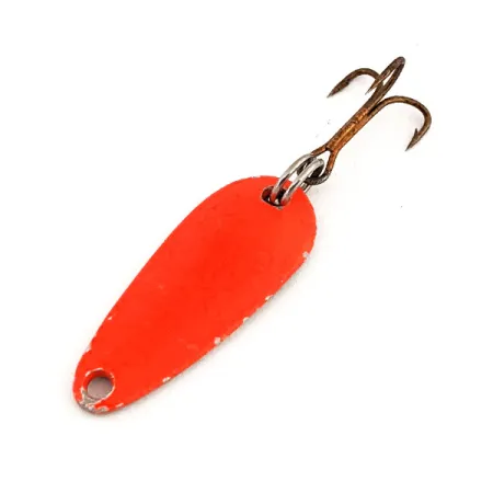 Con una longitud exacta de 3 cm (1 1/4"), esta cucharilla ondulante vintage presenta un perfil en forma de lágrima diseñado para pescas ligeras. El ejemplar cuenta con un acabado naranja de alta visibilidad en la cara frontal que, como indica el nombre Otto's Ace UV, brilla intensamente bajo la luz ultravioleta. Con un peso de 3g (3/32oz), el señuelo se identifica con el código de producto 12763 y fue fabricado en los USA. Un dorso plateado complementa el frontal naranja brillante, mientras que el montaje consta de una anilla abierta y un anzuelo triple. Calificado con una condición de 5/5, el señuelo muestra un ligero desgaste en los bordes de la pintura y un tono oscurecido en la superficie metálica del anzuelo.