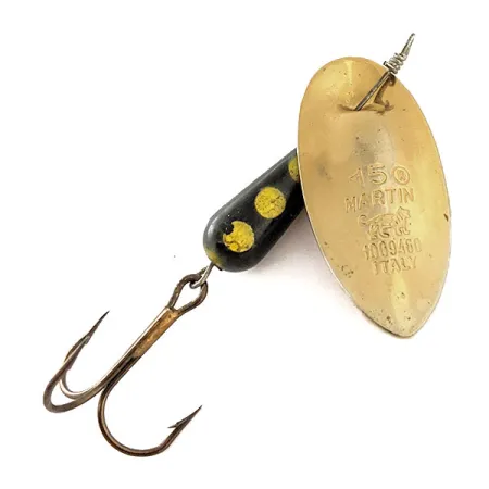 Grabada con el número 15 y la palabra "ITALY" en su superficie cóncava, la hoja con acabado dorado es el sello distintivo de esta cucharilla giratoria clásica. Este modelo específico, bajo el código 11965, cuenta con un cuerpo de plomo en forma de lágrima acabado en negro intenso con tres puntos amarillos prominentes. El diseño utiliza una hoja montada directamente en el eje, donde el alambre atraviesa el metal, una elección técnica que facilita una rotación inmediata. Con un peso de 15 g (1/2 oz) y una longitud de 6 cm (2 1/4"), proporciona el peso necesario para lances profundos o para alcanzar objetivos en medio de la corriente. El equipo incluye un robusto anzuelo triple de bronce con un desgaste mínimo. Este ejemplar está en excelentes condiciones, con una calificación de 5/5, con un brillo intenso en el baño de oro y una pintura nítida en el cuerpo lastrado. Una inspección detallada revela el logotipo de la pantera y el número de patente 1009460 grabados claramente en la superficie de la hoja.