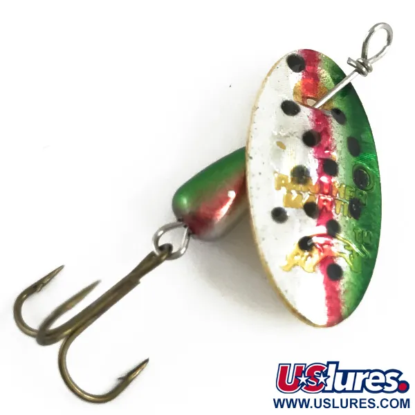 El oro pulido en el reverso de la hoja crea un destello de alta visibilidad que complementa el detallado patrón de Trucha Arcoíris en el frente. Con 3,5 cm de longitud, esta cucharilla giratoria utiliza el icónico diseño de hoja pasante en el que Panther Martin fue pionero para un alto rendimiento de rotación. El cuerpo de lágrima contrapesado, con un peso de 2,5 g, está pintado con un degradado metálico verde y rojo que transiciona suavemente. Este artículo en particular, código de producto 4375, pertenece a la época de fabricación italiana de la marca y se conserva sin usar. La cara de la hoja presenta una base blanca con bordes verdes, una franja vertical roja y puntos negros nítidos para imitar el pasto local. Un anzuelo triple estándar con acabado en bronce está unido mediante un robusto lazo de alambre en la base del cuerpo contrapesado.