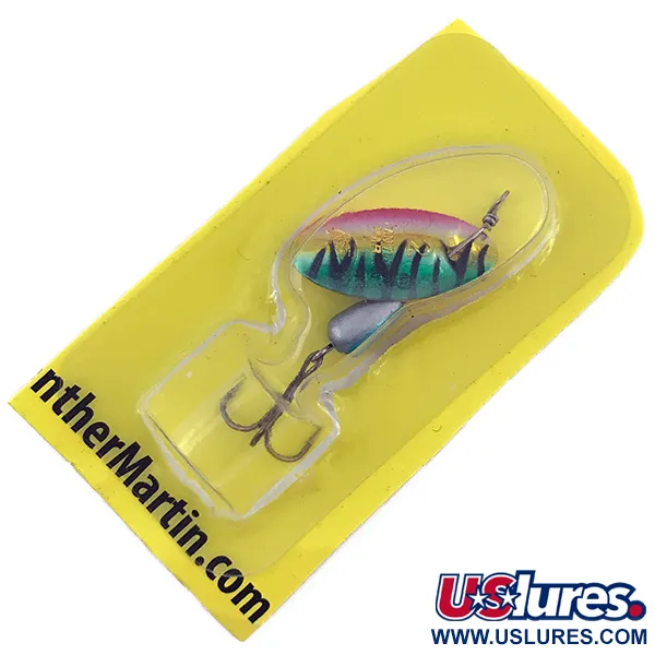 Vibrantes tonos rosas, amarillos y verdes definen el patrón Fire Tiger en la hoja de esta clásica cucharilla giratoria, acentuada por barras verticales oscuras y un acabado reflectante. Con un peso de 2,5 g (3/32 oz) y una longitud total de 5 cm (2"), esta Panther Martin 2 presenta el característico cuerpo pesado en forma de gota de la marca y una exclusiva hoja montada directamente en el eje. A diferencia de muchas cucharillas en línea, la hoja está montada directamente a través del eje, una característica de diseño que le permite girar libremente y situarse más cerca del cuerpo durante la recogida. Este modelo específico, con el código de producto 4993, proviene de Harrison-Hoge Industries y aún se encuentra en su embalaje original de cartón amarillo. El cuerpo tiene un acabado en un suave tono azul-plata metalizado, que remata en un afilado anzuelo triple. Se mantiene sin usar y se conserva en su blíster original, donde la tarjeta amarilla del reverso muestra la información de contacto de la sede central en Port Jefferson, Nueva York.