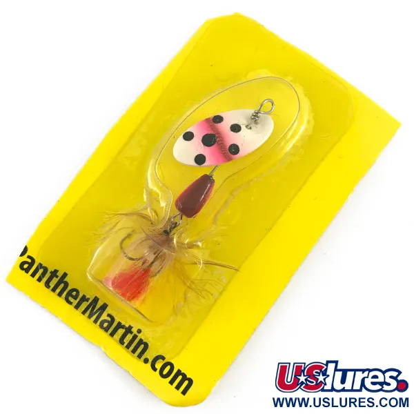 Un degradado rosa y blanco vibrante cubre la pala convexa de este modelo, acentuado por llamativos puntos negros que definen la estética clásica de Panther Martin. Esta cucharilla en línea de 3/32 oz (2,5 g) cuenta con la característica pala montada directamente sobre el eje, un sello distintivo de la marca desde su creación. Registrada con el código de producto 4603, el señuelo mide 2" (5 cm) de largo y pertenece a la serie UV-enhanced, que utiliza acabados fluorescentes para mayor visibilidad. El cuerpo tiene un acabado en tono rojo burdeos profundo, que remata en un anzuelo triple con plumas naturales y un teaser rojo brillante. Distribuido por Harrison-Hoge Industries de Port Jefferson, NY, el señuelo está sin usar y se presenta en su blíster amarillo original. La tarjeta amarilla trasera incluye advertencias de seguridad sobre los anzuelos extremadamente afilados y la dirección web PantherMartin.com impresa en el borde.