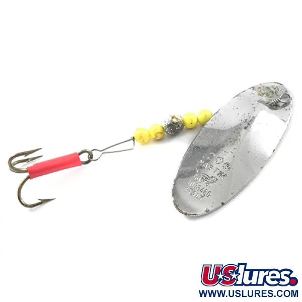 Marcada claramente con el icónico logotipo del león y un número de patente, esta cucharilla vintage de fabricación italiana muestra la ingeniería de precisión que definió a la marca. Con un peso sustancial de 21 g (3/4 oz) y una longitud total de 10 cm (4"), este modelo de la serie '20' está construido para alcanzar grandes distancias de lanzado y presentaciones profundas. La hoja presenta un acabado de Níquel clásico, mostrando ligeras marcas superficiales y signos de uso que reflejan su edad e historia. Utiliza el distintivo diseño de eje pasante donde la hoja gira directamente sobre el alambre, una característica emblemática de Panther Martin. Una secuencia de cuentas amarillas precede a una cuenta metálica texturizada y facetada cerca de la hoja, añadiendo una sutil variación visual al perfil del cuerpo. El terminal consiste en un anzuelo triple equipado con un tubo atractor rojo, proporcionando un fuerte contraste visual contra los componentes plateados. Identificado con el código de producto 1844, el estado de este espécimen se califica como 3/5, conservando todos sus componentes originales y el sello claro 'ITALY' en la superficie cóncava de la hoja.