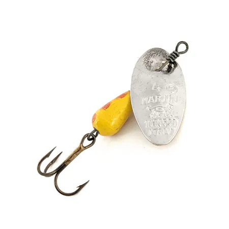 Claramente grabada en la hoja plateada de esta Panther Martin 4 se encuentra la marca de su origen italiano, un detalle muy valorado por los coleccionistas de aparejos antiguos europeos. El cuerpo en forma de lágrima, con un peso de 4 g (1/8 oz), presenta un acabado clásico en amarillo con distintivos puntos rojos. Con una longitud de 4 cm (1 1/2"), el señuelo está equipado con un robusto anzuelo triple y la icónica hoja en línea que atraviesa directamente el eje. Este método de construcción específico, donde la hoja gira directamente sobre el alambre en lugar de un estribo, es el sello distintivo de los diseños de mediados de siglo de la marca. Calificado con un 5/5, el ejemplar está en excelentes condiciones, con la pintura conservando su brillo original y las superficies metálicas sin deslustre significativo. La cara de la hoja lleva grabado el logotipo de la pantera saltando y la designación "REG. U.S. PAT. OFF.". El trenzado del alambre en el ojal de sujeción permanece apretado y recto, indicativo de su montaje original de fábrica.
