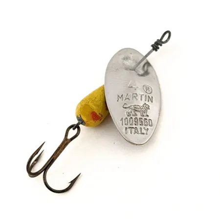 Troquelada con el número 4 y el icónico logotipo del león, la pala plateada de esta cucharilla vintage muestra claramente su origen italiano. El cuerpo en forma de gota presenta una base amarilla con puntos rojos, con un ligero desgaste en la pintura que refleja su historia en la caja de pesca. Este diseño de Panther Martin monta la pala directamente sobre el eje, eliminando la necesidad de un estribo tradicional. Pesa 1/8 oz (4 g) y tiene una longitud total de 1 1/2" (4 cm). Un anzuelo triple oscurecido pero estructuralmente sólido está sujeto en la parte posterior, y el señuelo está registrado oficialmente con el código 13181. Dada su sólida estructura y el metal limpio, mantiene una calificación de estado de 5/5.