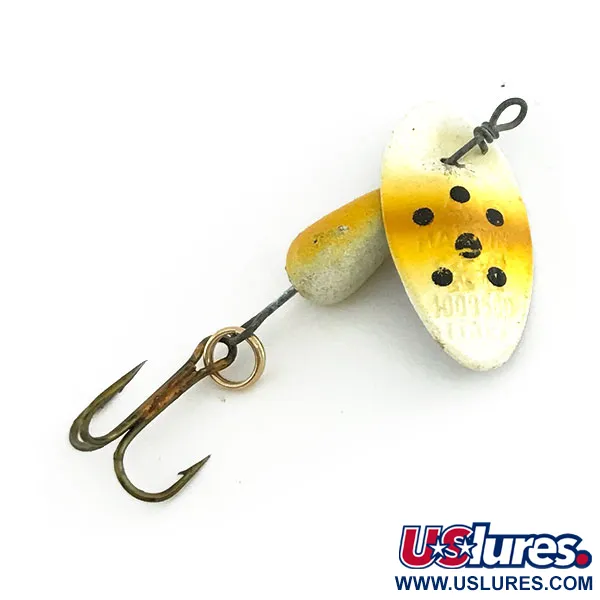 Con el grabado "MADE IN ITALY" en la pala, esta cucharilla giratoria representa la artesanía clásica de la marca Panther Martin. Este ejemplar de 4 g (1/8 oz), código de producto 9264, presenta la icónica construcción de eje pasante donde la pala gira directamente sobre el alambre sin necesidad de estribo. Con una longitud de 4 cm (1 1/2"), está acabada en el patrón "Brown Trout", que consiste en un degradado amarillo y crema salpicado de puntos negros tanto en la pala como en el cuerpo lastrado. El montaje incluye el eje de alambre original, un anilla abierta dorada y un anzuelo triple de bronce. Calificada con un estado 5/5, la pintura del cuerpo de plomo en forma de lágrima permanece nítida y bien definida. Este modelo específico está diseñado para la pesca con línea ligera, pensado principalmente para lanzar en pequeñas pozas de corriente.