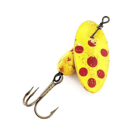 La artesanía italiana es claramente visible en este ejemplar, específicamente en el estampado "ITALY" de la hoja pintada de amarillo. Con un peso de 1/8 oz (4 g) y una medida de 1 1/2" (4 cm), esta Panther Martin 4 Con Punti presenta el icónico cuerpo en forma de lágrima che proporciona un excelente equilibrio de lance en arroyos pequeños. El vibrante acabado amarillo se acentúa con siete puntos rojos, un patrón que ha ayudado a definir el legado de la marca en la pesca de truchas durante décadas. En el reverso, la hoja revela su metal de latón, mostrando pequeños signos de uso que reflejan una calificación de estado de conservación de 4/5. Identificado con el código de producto 11805, el señuelo utiliza el diseño de eje pasante donde la hoja gira directamente sobre el alambre en lugar de un estribo. El montaje consiste en un anzuelo triple oscuro y resistente unido mediante un lazo estándar.