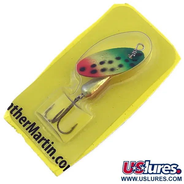 Pintada con un vibrante patrón de trucha arco iris, esta cucharilla Panther Martin 4 UV presenta un distintivo acabado reactivo a los rayos UV diseñado para mejorar la visibilidad. Con un peso preciso de 4 g, utiliza el clásico cuerpo en forma de lágrima de la marca para lances estables. La hoja está montada directamente sobre el eje, un diseño característico que permite que el componente gire sin necesidad de un estribo separado. Con una longitud de 4,5 cm, este ejemplar, identificado con el código 4996, permanece en su blíster original. Al ser un artículo sin usar, su estado está calificado como 6. Al observar de cerca la hoja, el degradado fluorescente cambia de un rojo cálido a un verde frío, acentuado por puntos oscuros. El anzuelo triple de bronce está firmemente unido al cuerpo lastrado, fabricado en la República Dominicana. El cartón amarillo de soporte sigue vibrante, mostrando la dirección web PantherMartin.com y la información de contacto de Harrison Hoge Industries de Port Jefferson, NY.