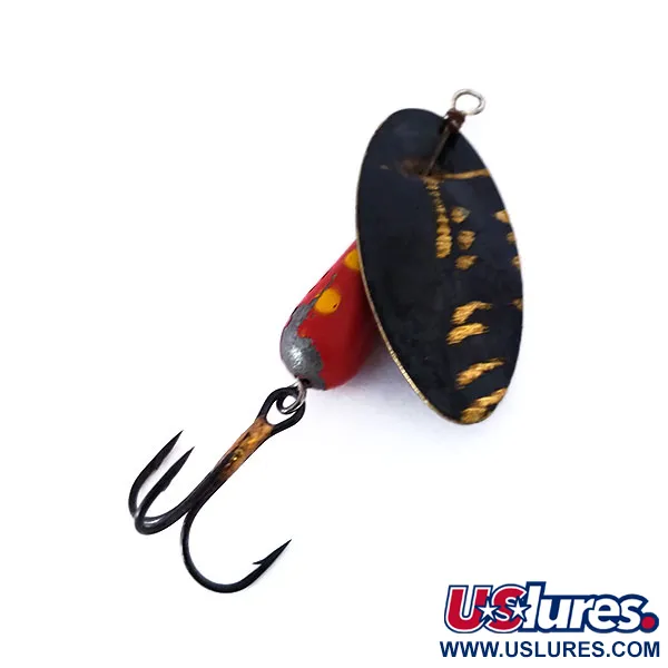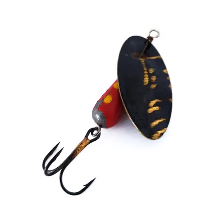 Un cuerpo rojo en forma de lágrima con motas amarillas brillantes define esta cucharilla giratoria vintage de fabricación italiana, catalogada bajo el código de producto 10482. Con un peso de 6g (3/16oz), el señuelo presenta el diseño característico de Panther Martin de hoja en línea, donde el eje pasa directamente a través del metal, una elección de construcción que permite que la hoja gire alrededor del cuerpo con una resistencia mínima. La hoja en sí tiene un acabado en negro intenso con marcas doradas aplicadas a mano que parecen pequeñas alas o escamas. Con una longitud de 5,5 cm, el conjunto incluye una pequeña cuenta de latón situada sobre el cuerpo rojo lastrado. La hoja está claramente estampada con el nombre del fabricante y su país de origen, Italia. Este ejemplar en particular se encuentra en un estado excepcional, con una calificación de 5/5, manteniendo la pintura original del cuerpo y el acabado oscuro del anzuelo triple notablemente limpios. El número 6 es visible en el cuerpo rojo, indicando el tamaño de modelo específico utilizado por generaciones de pescadores de río.