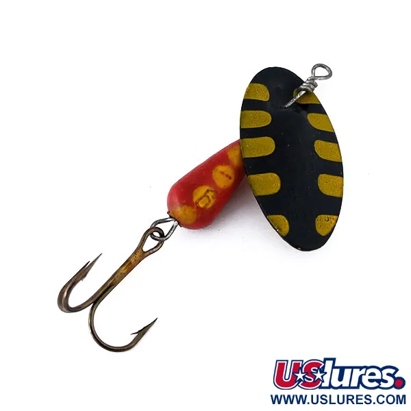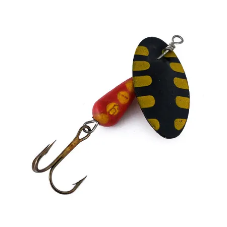 Barras horizontales amarillas adornan la superficie convexa negra mate de esta hoja de cucharilla de tamaño 6. Con un peso de 6 g (3/16 oz) y una longitud de 5,5 cm, este ejemplar fabricado en Italia presenta el icónico diseño de eje a través de la hoja que distingue a esta marca en el mundo de las cucharillas en línea. El cuerpo en forma de lágrima está acabado en una pintura roja brillante con puntos amarillos, mostrándose notablemente bien para su edad con una calificación de estado de 5/5. Al girar el señuelo, se revela un envés dorado pulido en la hoja, complementado por una pequeña cuenta espaciadora de latón situada justo encima del cuerpo lastrado. Sujeto mediante un lazo de alambre seguro, el anzuelo triple bronceado se mantiene en excelente forma. Registrado bajo el código de producto 10844, este señuelo ejemplifica la estética clásica de las exportaciones de material de pesca europeo de mediados de siglo.