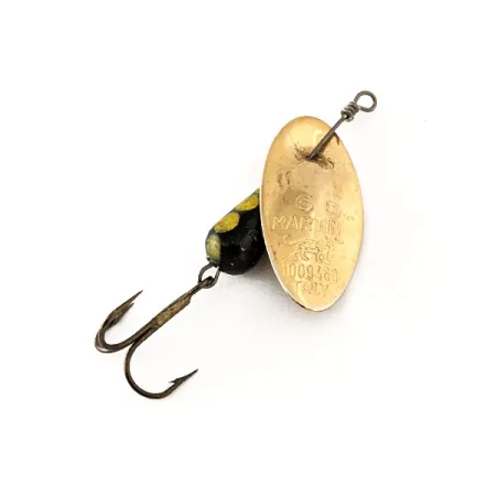 El logotipo vintage de Panther Martin y la marca de origen Italy están claramente estampados en la pala dorada convexa, lo que distingue a este modelo de producción temprana. Este espécimen, designado con el código de producto 11117, presenta el clásico cuerpo de lágrima negro decorado con vibrantes puntos amarillos para un alto contraste bajo el agua. Con una medida de 5,5 cm (2 1/4") y un peso de 6 g (3/16 oz), el señuelo utiliza una construcción en línea donde la pala se monta directamente sobre el eje. Esta elección de diseño específica, pionera de la marca, crea un perfil de rotación único en comparación con las cucharillas tradicionales montadas con estribo. El hardware consiste en un anzuelo triple bronceado y un ojal de alambre fuertemente enrollado, ambos con una preservación excepcional. Con una calificación de estado de 5/5, el acabado dorado de la pala y la pintura del cuerpo lastrado permanecen notablemente nítidos y libres de desgaste.