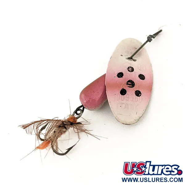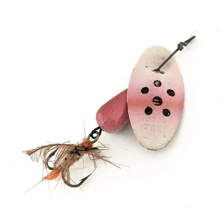 Cinco llamativos puntos negros destacan sobre el degradado blanco y rosa de la hoja, un diseño característico de este clásico de fabricación italiana. Con un peso de 6 g (3/16 oz), esta Panther Martin 6 mide 5 cm (2 in) y lleva el código de producto 12601. El cuerpo en forma de lágrima está pintado en un tono rosa a juego, rematado con un anzuelo triple con fibras marrones y naranjas. Debido a que la hoja está montada directamente sobre el eje de alambre, mantiene un perfil muy compacto en comparación con los spinners tradicionales de estribo. Este ejemplar se encuentra en un estado 5/5, con el sello "ITALY" en el reverso de la hoja perfectamente nítido y legible. Se aprecia el suave degradado rosa en la mitad superior de la hoja, que proporciona un bonito contraste con la base blanca. El armazón de alambre está firme y todos los componentes no muestran signos de desgaste ni envejecimiento, manteniendo su brillo original de fábrica.