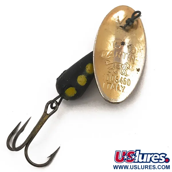 Grabado directamente en la hoja con acabado dorado se encuentra el icónico logotipo del gato saltando junto a la marca Italy, confirmando la herencia de esta clásica cucharilla giratoria in-line. Este ejemplar de 5 cm presenta el característico cuerpo en forma de gota con un acabado en negro profundo y tres puntos amarillos distintivos. Con un peso de 6 g (3/16 oz), el diseño se centra en su exclusiva hoja montada directamente sobre el eje que gira sin necesidad de un estribo. El chapado en oro de la hoja es notablemente claro, mostrando el número de patente 1005460 y la marca del fabricante original. El equipo incluye un anzuelo triple afilado y oscurecido, y el estado general es un excelente 5/5, con la pintura y el acabado metálico mostrando muy pocos signos de antigüedad. Esta iteración específica representa la producción italiana de alta calidad que convirtió a estos señuelos en un elemento básico para la pesca en arroyos.