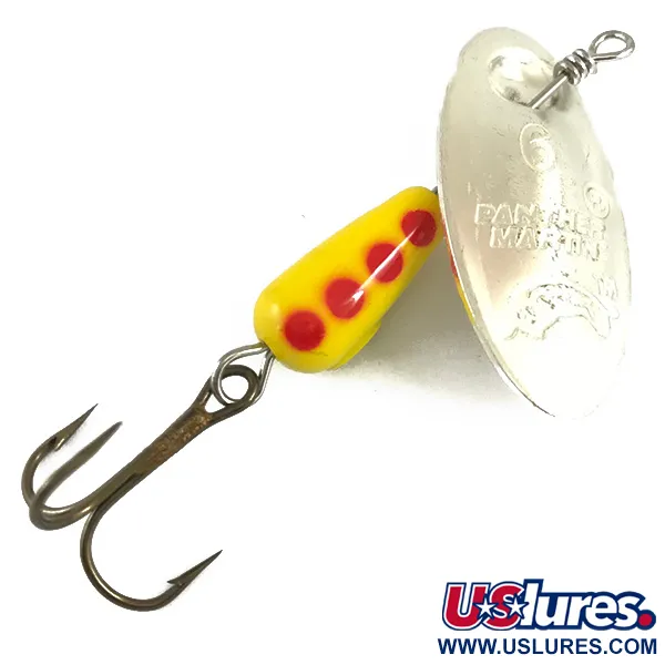 Con un peso de 6 g (3/16 oz), esta Panther Martin del número 6 es una opción formidable para lanzar en pozas profundas o corrientes cruzadas. El cuerpo en forma de lágrima está acabado en un esmalte amarillo brillante con cuatro puntos rojos marcados, una combinación de colores que ha sido la favorita de los pescadores de truchas durante más de medio siglo. Montada directamente sobre el eje, la pala plateada lleva grabados el número de tamaño y el origen italiano de la marca, un detalle de construcción que elimina la necesidad de un estribo. Este ejemplar específico, identificado con el código de producto 4378, está sin usar y conserva su brillo original de fábrica. Con una longitud de 5 cm (2"), el señuelo está equipado con un anzuelo triple robusto y bronceado. Importado originalmente de Italia desde la década de 1950, su diseño confía en el peso del cuerpo para proporcionar el lastre necesario y lograr lances precisos bajo las orillas socavadas.