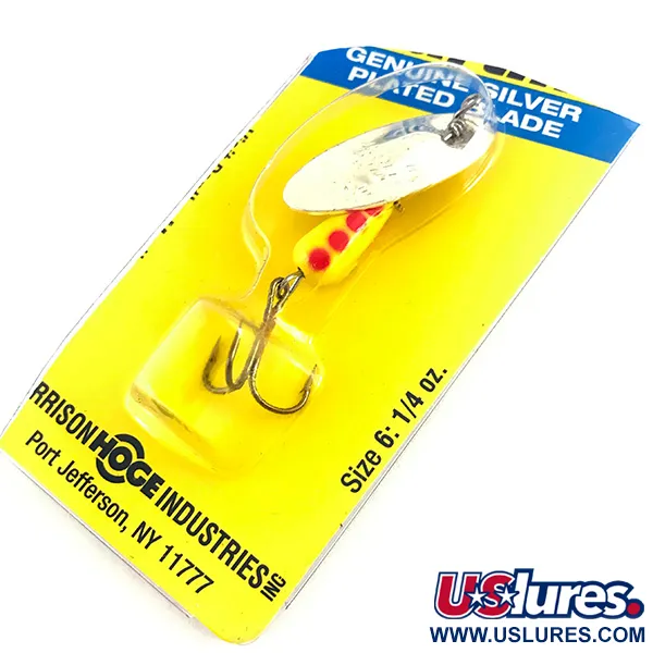 Con un peso de 1/4 oz (7 g), esta clásica cucharilla giratoria de tamaño 6 presenta el diseño característico de hoja Panther Martin montada directamente en el eje, lo que permite una rotación inmediata. El cuerpo en forma de lágrima pintado de amarillo está decorado con tres puntos rojos distintos, un patrón de color que ha sido un referente para los pescadores de truchas y peces de río durante décadas. La hoja con baño de plata real tiene una concavidad única para montarse directamente en el eje de alambre de 5 cm (2") sin necesidad de un estribo. Este ejemplar específico, identificado con el código de producto 4581, se conserva en su embalaje original de Harrison-Hoge Industries de Port Jefferson, NY. Fabricado en la República Dominicana, el señuelo tiene una calificación de estado 6 y permanece sin usar dentro del blíster. La construcción del cuerpo pesado está diseñada específicamente para facilitar la distancia de lanzado tanto en aguas tranquilas como en corrientes.