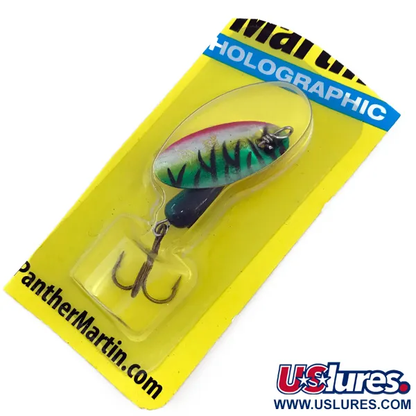 Con un peso de 6 g (3/16 oz), esta cucharilla giratoria de la serie holográfica es un ejemplo perfecto del innovador diseño de pala montada sobre el eje que ha definido a la marca desde los años 50. El cuerpo de 5 cm (2") presenta un llamativo patrón Fire Tiger, con una pala que combina tonos verdes, amarillos y rojos sobre un acabado holográfico reflectante. Este ejemplar sin usar, código de producto 5001, permanece en su blíster original amarillo y azul, mostrando el cuerpo lastrado de acabado oscuro y una afilada potera de acabado bronce. Fabricada en la República Dominicana, la pala está diseñada para asentarse directamente sobre el eje, lo que le permite girar con un ángulo más cerrado y una frecuencia más alta que las cucharillas tradicionales de estribo. Esta construcción específica ayuda al señuelo a mantener la profundidad durante la recogida, mientras que el cuerpo en forma de lágrima aporta la masa necesaria para lances a larga distancia en pequeños arroyos o ríos.