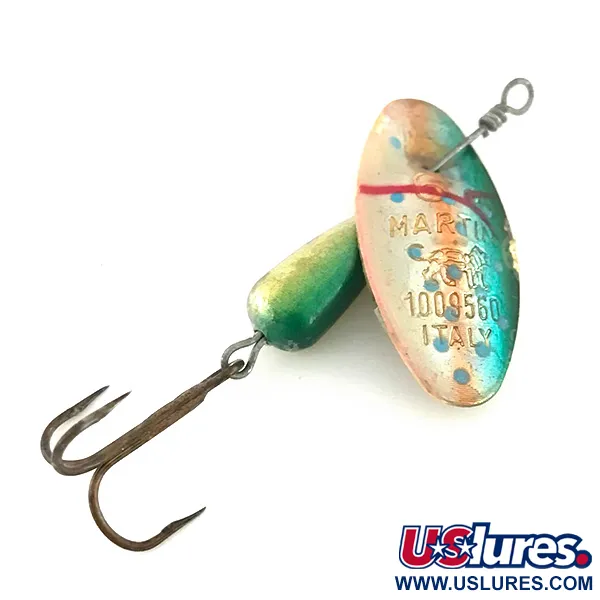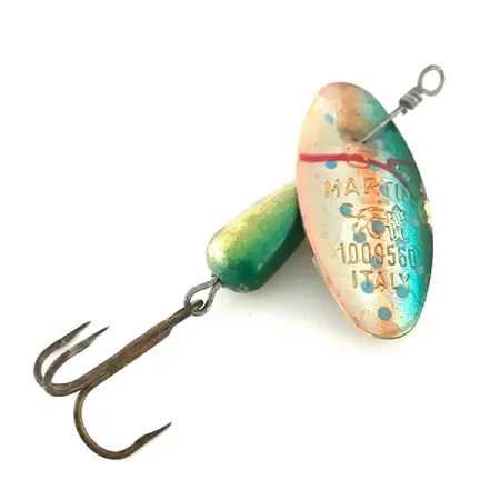 El estampado en la hoja plateada confirma que este Panther Martin 6, código de producto 8536, es originario de Italia, con el distintivo logotipo del león y el número de patente 1009560. Con un peso de 3/16 oz (6 g) y una medida de 2 1/4" (5,5 cm), este ejemplar muestra el clásico cuerpo de lágrima con un degradado de verde a dorado. La hoja de diseño único, que pasa directamente a través del eje de alambre en lugar de utilizar un estribo, muestra un acabado Blue/Silver con distintos puntos azules y un perímetro teñido de verde azulado. Este montaje directo al eje es un sello distintivo de la ingeniería de la marca, destinado a una rotación cercana al cuerpo. Conservado en una condición calificada como 5/5, el herraje permanece sólido con un anzuelo triple original de tono oscuro. Las versiones de estos spinners fabricadas en Italia son muy valoradas por los coleccionistas por su estampado preciso y sus transiciones de color específicas.