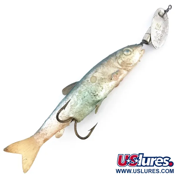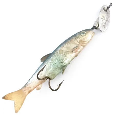 Con el número de registro 103346 grabado en su hoja plateada, esta cucharilla de fabricación italiana muestra la ingeniería clásica por la que Panther Martin es reconocida. El cuerpo realista imita a un pez pasto, mide 14 cm (5 1/2") y presenta un detallado patrón de escamas mit un suave degradado azul verdoso en el lomo. Con un peso de 21 g (3/4 oz), su construcción incluye un espaciador de bala lastrado situado entre la característica hoja montada en el eje y el cuerpo con forma de pez. Bajo el vientre, incorpora un robusto anzuelo doble diseñado para una clavada firme tanto en lanzado como en curricán. Este ejemplar, identificado con el código 5013, se encuentra en un estado de conservación 4/5, mostrando una definición clara de ojos y agallas junto a la marca 'MARTIN' grabada en el metal. La cola y las aletas han adquirido un ligero tono dorado con el tiempo, contrastando con la sección central plateada.