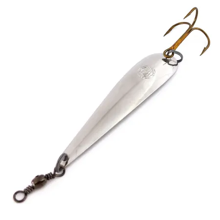 Un acabado en níquel brillante otorga a esta Panther Martin Alborella Verbano Tirlindada de 9 cm (3 1/2") un perfil de alta reflectividad, una característica clave para los pescadores que buscan aguas profundas. Originaria de Italia, esta cucharilla específica para curricán pesa 11 g (2/5 oz) y está meticulosamente moldeada para imitar a los peces pasto delgados que se encuentran en la región de Verbano. Identificado con el código de producto 12237, el ejemplar se encuentra sin usar, obteniendo una calificación de 6 por su estado original impecable. El montaje incluye un anzuelo triple seguro en la cola y un emerillón de barril integrado en el morro, diseñado para gestionar la tensión de la línea durante sesiones prolongadas de curricán. El sello del fabricante es claramente visible en el lado convexo de la pala, confirmando su pedigrí vintage.