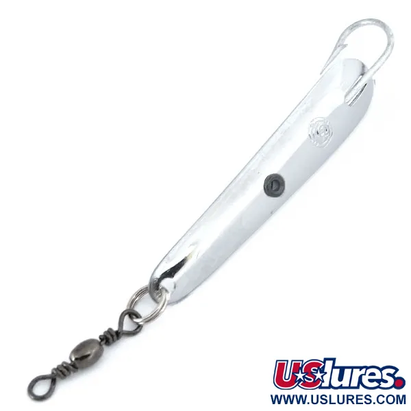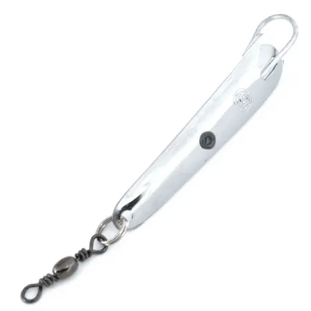 Originaria de Italia, esta estilizada cucharilla ondulante con acabado en Níquel mide exactamente 6cm (2 1/4"). La Panther Martin Cheppia con Amo es un señuelo metálico especializado que presenta un diseño distintivo de anzuelo simple, donde el anzuelo está fijado directamente al cuerpo pulido. Este ejemplar específico, catalogado con el código de producto 10874, se encuentra sin usar. Con 5,5g (3/16oz), el peso está concentrado para el lanzado o la presentación vertical. Un pequeño elemento circular negro está centrado en el cuerpo, proporcionando un sutil contraste con la superficie de alto brillo. El punto de sujeción viene equipado con una anilla abierta resistente y un quitavueltas de barril oscurecido para reducir la torsión de la línea durante la recogida. El icónico logotipo de Panther Martin está claramente estampado en el niquelado cerca del extremo del anzuelo.