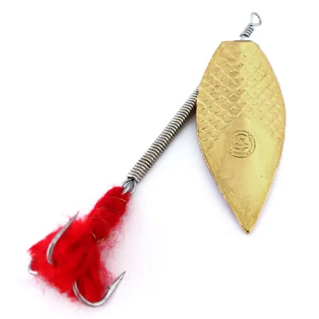 Las escamas doradas grabadas en la pala otorgan a esta cucharilla giratoria una textura realista que la diferencia de los acabados lisos estándar. Esta Panther Martin Francese Tirlindada con Lana, código de producto 10274, es un ejemplar auténtico fabricado en Italia que cuenta con un diseño de pala montada directamente sobre el eje. Esta construcción permite una velocidad de inicio más rápida y una rotación de pala más amplia durante la recogida. La propia pala está marcada con un "9" y muestra un acabado de doble patrón: el frente tiene escamas doradas texturizadas, mientras que la parte trasera presenta una punta roja sólida y pequeños puntos rojos. Para añadir volumen y un punto de ataque, el anzuelo triple está adornado con un grueso mechón de lana roja, o "Lana". Con una medida de 7 cm y un peso de 5 g, es una opción perfectamente equilibrada para la trucha de río o la perca. Esta pieza de coleccionista está sin usar y mantiene su brillo original. El eje de alambre está reforzado con una bobina tipo muelle justo por encima del ojal del anzuelo, proporcionando una integridad estructural adicional al conjunto.
