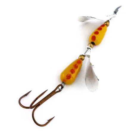 Dos palas de níquel troquelado, de tamaños 3 y 4, definen el perfil de esta cucharilla tándem vintage de fabricación europea. Cada pala está emparejada con el característico cuerpo en forma de lágrima, acabado con una base de color amarillo brillante y acentuado con cuatro marcados puntos rojos. Este ejemplar, catalogado con el código de producto 10868, fue fabricado en Italia y representa una configuración tándem poco común en la gama de Panther Martin. Su construcción cuenta con un armazón de alambre único con las palas girando directamente sobre el eje, que termina en un anzuelo triple afilado con acabado bronceado. Este señuelo se encuentra sin usar, manteniendo su acabado original de fábrica y su brillo tanto en la pintura como en los herrajes metálicos. Con un peso de 1/2 oz (14 g) y una longitud total de 3 1/2" (9 cm), ofrece un perfil voluminoso para buscar grandes truchas o black bass en aguas profundas. Las palas niqueladas están claramente grabadas con el nombre "MINKEN" y sus respectivos tamaños en la cara convexa.