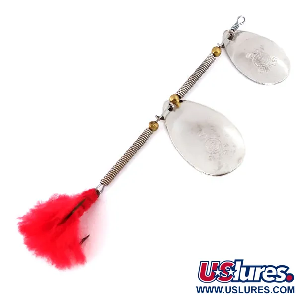 Dos hojas con acabado plateado están montadas en configuración tándem sobre un eje de alambre de 9 cm (3 1/2"), creando el perfil distintivo de esta cucharilla giratoria de fabricación italiana. Con un peso de 6 g (3/16 oz), el señuelo incorpora el diseño característico de Panther Martin con la hoja montada directamente en el eje, donde el metal gira alrededor del alambre sin necesidad de un estribo tradicional. El código 10260 designa la variante Con Mosca, que presenta un prominente adorno de plumas rojas sobre el anzuelo triple que proporciona un suave contraste visual con el cuerpo metálico. Pequeñas cuentas de latón sirven como espaciadores entre las secciones de muelle, asegurando que las dos hojas permanezcan correctamente separadas. Este ejemplar específico de Simplex Tandem está sin usar y se mantiene en excelente estado. Las hojas llevan el icónico sello de Panther Martin, una marca de la calidad que se encuentra en estos señuelos vintage producidos en Italia.