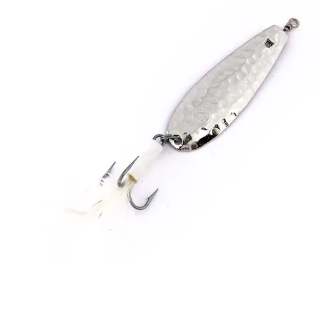 Los acabados en níquel martillado definen la superficie reflectante de esta cucharilla de fabricación italiana, una elección de diseño destinada a maximizar los destellos durante el lance o el curricán. Con un peso de 5,5 g (3/16 oz) y una longitud de 5,5 cm (2 1/4"), esta Panther Martin Svizzero Martellato con penna está sin usar. El señuelo, catalogado con el código de producto 10255, cuenta con un anzuelo triple con plumas blancas que aporta un perfil visual suave y natural. Fabricada en Italia, la estructura incluye un robusto quitavueltas superior para minimizar la torsión de la línea. Cada hoyuelo del metal está golpeado con precisión y el adorno blanco del anzuelo se mantiene limpio y bien conservado.
