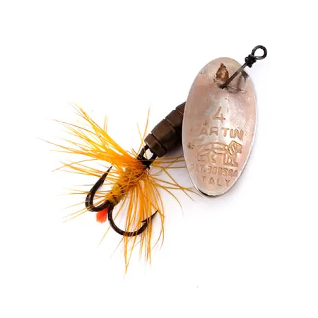 Grabada con la marca "ITALY" y el número de patente 331544 en la hoja, esta cucharilla vintage muestra la fabricación de alta calidad de su época. Esta Panther Martin Zavorra con Mosca 4, código de producto 10554, presenta la construcción característica donde la hoja se monta directamente sobre el eje, lo que le permite girar sin necesidad de estribo. El espécimen lleva una designación de color Oro, visible en los tonos ricos y profundos del cuerpo de lágrima lastrado. El anzuelo triple está meticulosamente adornado con plumas hackle naranja-jengibre y rematado con una distintiva lana roja, identificándolo como un tipo con mosca. Con una medida de 4 cm (1 1/2") y un peso de 3 g (3/32 oz), el señuelo es un ejemplo clásico de cucharilla de trucha para equipo ligero. La hoja metálica conserva un acabado limpio y el estado general de esta pieza está calificado como 5/5. Las Panther Martin auténticas fabricadas en Italia son muy valoradas por los coleccionistas que aprecian el grabado preciso y el equilibrio de pesos de estas primeras exportaciones europeas.
