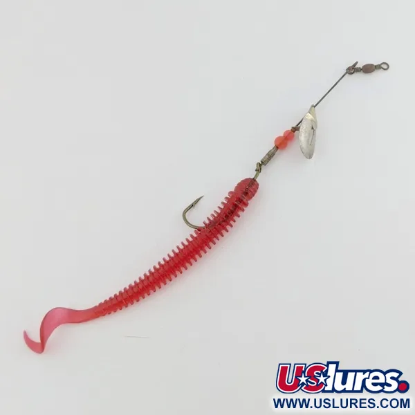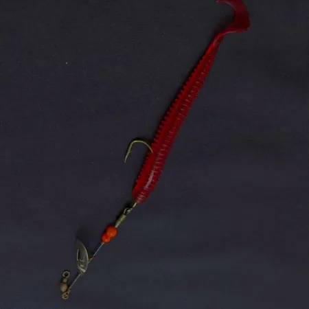 El niquelado de la hoja de este spinner de 3/16 oz (6 g) proporciona un destello sutil contra el vibrante rojo de la cola de plástico blando. Con una longitud total de 10 cm, el Pflueger June Bug №4 cuenta con el característico brazo offset diseñado para que la hoja gire sin interferir con el eje principal. Dos cuentas rojas están colocadas en el alambre para añadir un toque de color y equilibrar el montaje. El aparejo está equipado con un anzuelo simple montado con un vinilo de cola rizada que aumenta significativamente el perfil visual. Con una calificación de estado de 4/5, el alambre metálico y los componentes han mantenido su integridad estructural. Este artículo, con código de producto 24501, es un ejemplo clásico de montaje multimaterial que combina un atractor metálico con un tráiler blando.