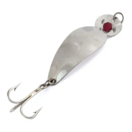 Los ojos de piedra preciosa roja, engastados con precisión a través de la cabeza del cuerpo metálico de 10 cm, le dan a esta cucharilla vintage un aspecto muy diferente al de los aparejos modernos producidos en serie. Claramente troquelada con el nombre del modelo en el reverso, la Popeye (Código de Producto 9840) presenta un acabado de níquel pulido que mantiene una calidad brillante y reflectante. Con un peso sólido de 28 g, el cuerpo metálico está moldeado con una curva sutil, diseñada para la distancia de lanzado y la estabilidad en el agua. El montaje incluye un anzuelo triple duradero y anillas abiertas tanto en la punta como en la cola, todo ello en un estado bien conservado que refleja una calificación de 4/5. Esta cucharilla representa una era específica del diseño de aparejos de EE. UU. donde el trabajo funcional del metal se unía al estilo decorativo. La superficie de níquel está limpia, mostrando solo los signos más leves de la edad propios de un artículo almacenado cuidadosamente.