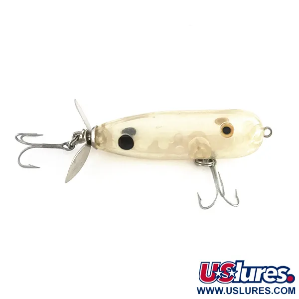 Una única hélice de tono plateado se asienta en la parte trasera de este clásico walker de superficie, diseñado para agitar el agua durante una recogida constante. Con un peso de 9,5 g (1/3 oz) y una longitud de 6,5 cm (2 1/2"), este modelo presenta un cuerpo de plástico totalmente transparente que revela las bolas sonoras internas responsables de su perfil ruidoso. Identificado con el código de producto 7917, el señuelo es una creación distintiva de la empresa estadounidense The Producers. Su atractivo visual destaca por unos ojos pintados de gran tamaño y alto contraste, que ofrecen un blanco claro para depredadores de superficie como el black bass y el lucio. El equipo consta de dos poteras —una montada en el vientre y otra tras la hélice— conectadas a un cuerpo redondeado en forma de cigarro. Este ejemplar bien conservado no muestra signos de uso, con una calificación de estado de 5/5.