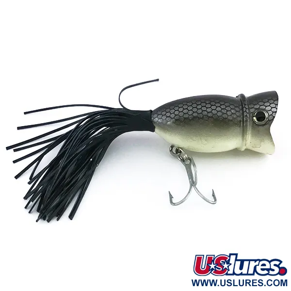 Una boca roja cóncava y profunda define el perfil frontal de este señuelo de superficie de 4 cm (1 1/2") de The Producers. Con un peso de 8g (1/4oz), el modelo 8054 presenta un marcado patrón de escamas grises sobre un vientre oliva pálido, lo que proporciona un contraste clásico típico de los aparejos americanos de mediados de siglo. La parte trasera está rematada con un denso haz de flecos de goma negra en lugar de las plumas tradicionales, lo que añade una presencia visual significativa al perfil. Este espécimen se encuentra en un estado 5/5, pareciendo totalmente sin usar con su pintura y herrajes originales conservados. Presenta un único anzuelo triple montado en el vientre y un enganche para la línea profundamente encastrado en la garganta roja, un diseño destinado a técnicas de lanzado en superficie. Como señuelo flotante y ruidoso, está diseñado para la presentación en superficie al buscar lucios o percas grandes.