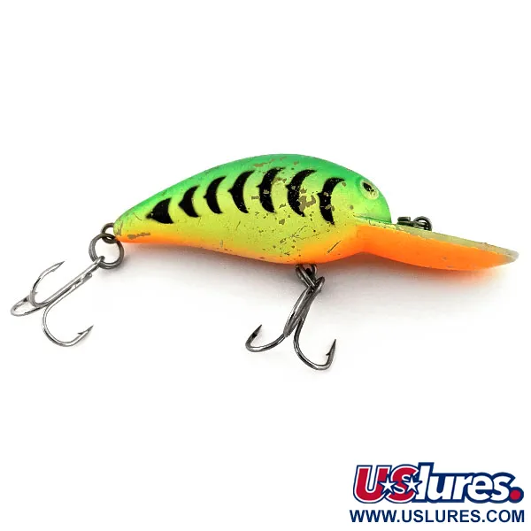 Con un vibrante patrón de color Fire Tiger, este señuelo vintage de fabricación estadounidense está diseñado tanto para lances como para curricán. Con un peso de 1/3 oz (10 g) y una longitud de 2 1/4" (5,5 cm), el Producers B52 UV está enfocado a la pesca de lucioperca y lucio en un rango de profundidad de 1,8–2,4 m (6–8 pies). Este modelo flotante con sonajero lleva el código de producto 13175 y destaca por sus propiedades UV-reactivas. Bajo la luz ultravioleta, el acabado brilla intensamente, una característica diseñada para mejorar la visibilidad en aguas profundas o turbias. El equipo incluye dos poteras afiladas, y el cuerpo muestra un ligero desgaste auténtico acorde con una calificación de estado 4/5. La garganta naranja brillante y el babero proporcionan un fuerte contraste con el lomo verde con barras negras.