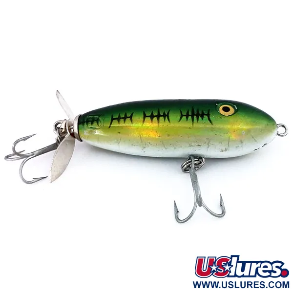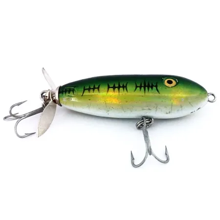 Los acabados verde arcoíris en los señuelos americanos vintage suelen mostrar una transición impactante de tonos forestales profundos a un dorado brillante, y este Producers Turbo es un excelente ejemplo. Con una medida de 6 cm (2 1/4") y un peso versátil de 9 g (1/3 oz), este señuelo de superficie cuenta con un distintivo patrón negro tipo espina sobre sus flancos iridiscentes. El cuerpo flotante en forma de torpedo está equipado con una hélice plateada montada en la parte trasera. Esta hélice está asegurada por un robusto cáncamo que también ancla el anzuelo triple trasero, mientras que un segundo triple se sitúa en el vientre para asegurar clavadas sólidas de lucios y percas. Con el código de producto 10597, el señuelo se mantiene en gran forma con una calificación de estado de 4/5, mostrando solo signos menores de su historial de pesca. Los grandes ojos amarillos pintados proporcionan un punto focal de alto contraste contra la cabeza verde oscuro. Como cebo flotante de superficie, el hardware está diseñado para la presentación en superficie donde la pala trasera crea una perturbación localizada durante una recogida constante.