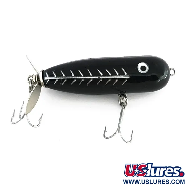 Adornado con un llamativo patrón de espinas plateadas sobre un acabado negro profundo, este Producers Turbo ofrece una estética clásica para los entusiastas del topwater. Con un peso de 9 g (1/3 oz) y una longitud compacta de 6 cm (2 1/4"), este señuelo de superficie fabricado en EE. UU. funciona como un propbait flotante para percas y lucios. El ejemplar presenta una única hélice plateada montada en la parte trasera y un perfil en forma de bala. En los laterales, las marcas plateadas de estilo óseo contrastan fuertemente con el cuerpo negro brillante, que se completa con grandes ojos blancos con pupilas negras. En la parte inferior, el señuelo monta dos anzuelos triples sujetos por herrajes resistentes. Este artículo específico, con código de producto 8076, mantiene una calificación de estado de 5/5, lo que refleja su excelente cuidado y los acabados metálicos brillantes.