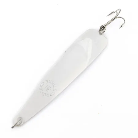 Grabado claramente en la mitad inferior de la pala, la marca 'QUICK STRIKE 31' identifica a esta cucharilla vintage de fabricación estadounidense. Con una longitud de 9,5 cm (3 3/4") y un peso de 4,5 g (3/16 oz), el señuelo presenta un cuerpo delgado y cónico con un acabado en plata pulida. Este ejemplar específico se encuentra en excelente estado, con la superficie reflectante brillante y los herrajes totalmente intactos, lo que le otorga una calificación de estado de 5/5. Un anzuelo triple está sujeto mediante una anilla abierta en la base más ancha, mientras que la cabeza estrecha presenta un orificio limpio para el nudo de la línea. Catalogada bajo el código de producto 22320, la rareza de esta pieza es evidente en su construcción metálica simple pero efectiva, diseñada para el lance o el curricán.