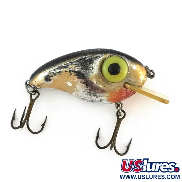 Con un peso de 8,5 g (1/3 oz), este Rabble Rouser Angel-Eye es una opción sólida para lances de precisión. El cuerpo plateado está acentuado por reflejos dorados y negros a lo largo del lomo, mientras que una mancha naranja distintiva marca la zona de la garganta. Con su homónimo "Angel-Eye", el señuelo luce grandes ojos amarillos saltones con pupilas negras profundas que sirven como un objetivo de alto contraste. Un babero de buceo cuadrado y transparente está fijado en el morro para facilitar una presentación de profundidad. Este señuelo vintage de fabricación estadounidense, identificado con el código de producto 8129, mide 5 cm (2") y conserva sus poteras originales con acabado en bronce. Con un estado de conservación de 4/5, el ejemplar muestra un ligero desgaste cosmético y el envejecimiento natural de la pintura, reflejando su historia en una caja de coleccionista. La construcción del cuerpo y la disposición de los anzuelos son características de la época de producción de Rabble Rouser en EE. UU.