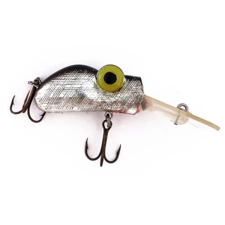 Un patrón de trama cruzada plateada define el perfil de 4,5 cm (1 3/4") de este ejemplar fabricado en EE. UU. Con un peso de 9 g (1/3 oz), el Rabble Rouser Roo-Tur está equipado con un babero ancho de plástico transparente diseñado para profundizarlas presentaciones. Un toque de rojo en la base del babero añade un sutil punto de contraste contra el cuerpo metálico brillante. Dos poteras con acabado bronceado están fijadas al vientre y a la parte trasera, mientras que los ojos amarillos de gran tamaño con pupilas negras le dan al señuelo su cara icónica. Catalogado con el código de producto 10278, el señuelo se encuentra en un estado 5/5 sin signos de uso en sus superficies reflectantes. La textura de rejilla en los laterales imita un patrón de escamas complejo, destacando el estilo de fabricación distintivo de la producción estadounidense de Rabble Rouser.