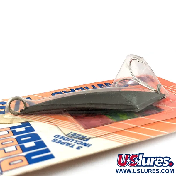 Con un peso de 17 g (3/5 oz), esta cucharilla de curricán presenta una geometría angular distintiva, característica de la serie Arrowhead T/S. Fabricado por Rebel, una marca de Pradco, este modelo lleva el código de producto 15144 y fue producido en EE. UU. Con una longitud de 9 cm (3 1/2"), el cuerpo metálico lleva estampado el logotipo de Rebel y presenta un acabado altamente reflectante. Aunque el catálogo especifica el color como Negro, el señuelo ofrece una superficie pulida diseñada para generar destellos durante el curricaneo a profundidades determinadas por un profundizador o dispositivo de inmersión. Este ejemplar sin usar permanece sellado en su envase original con copyright de 1990, que incluye tres cintas adhesivas de varios colores para personalizar la apariencia del señuelo bajo el agua. Avalado por el presentador de PBS Bill Saiff, el diseño fue adaptado específicamente para peces deportivos de los Grandes Lagos y de agua salada, como el salmón y la trucha arcoíris (steelhead).